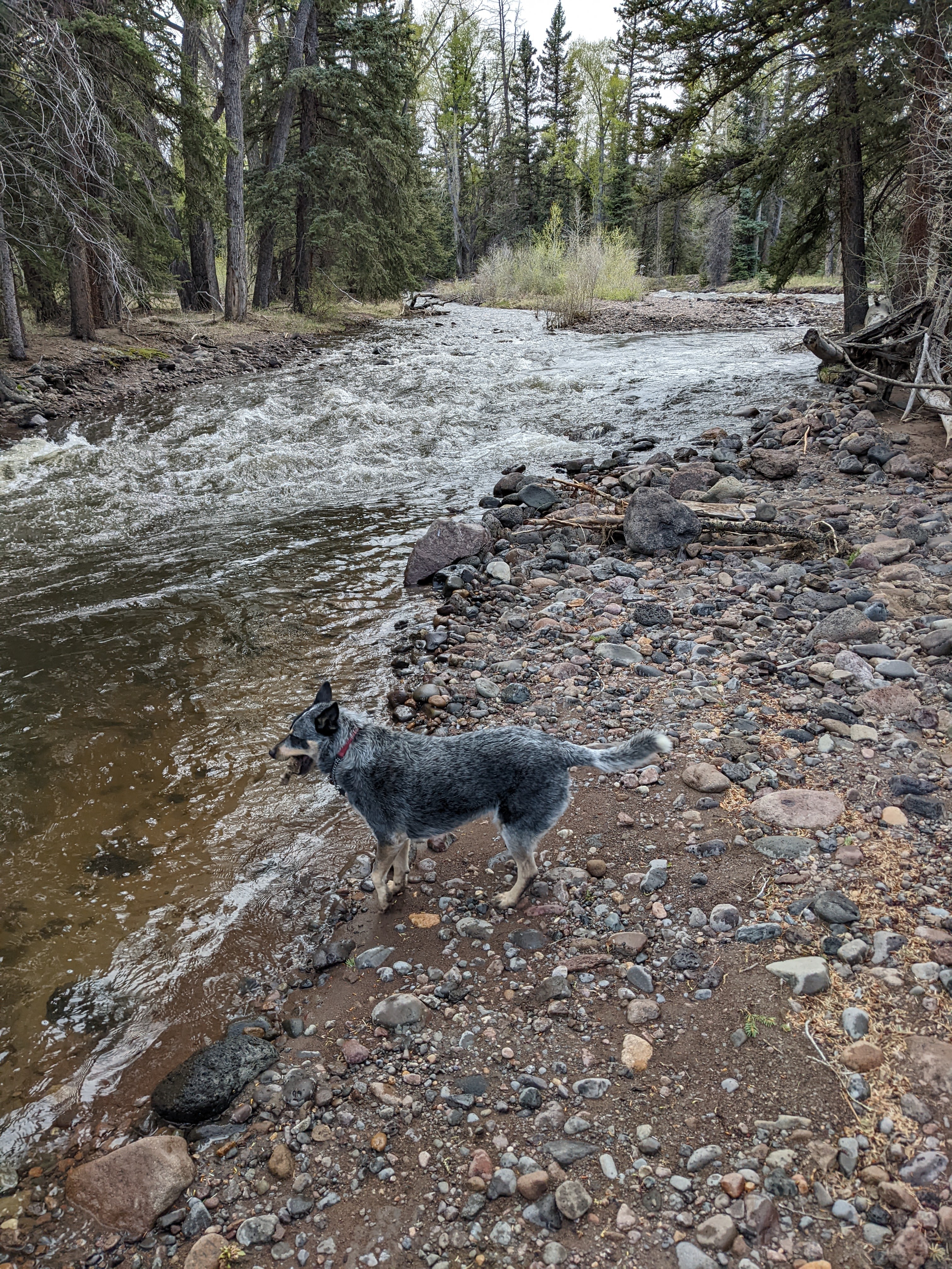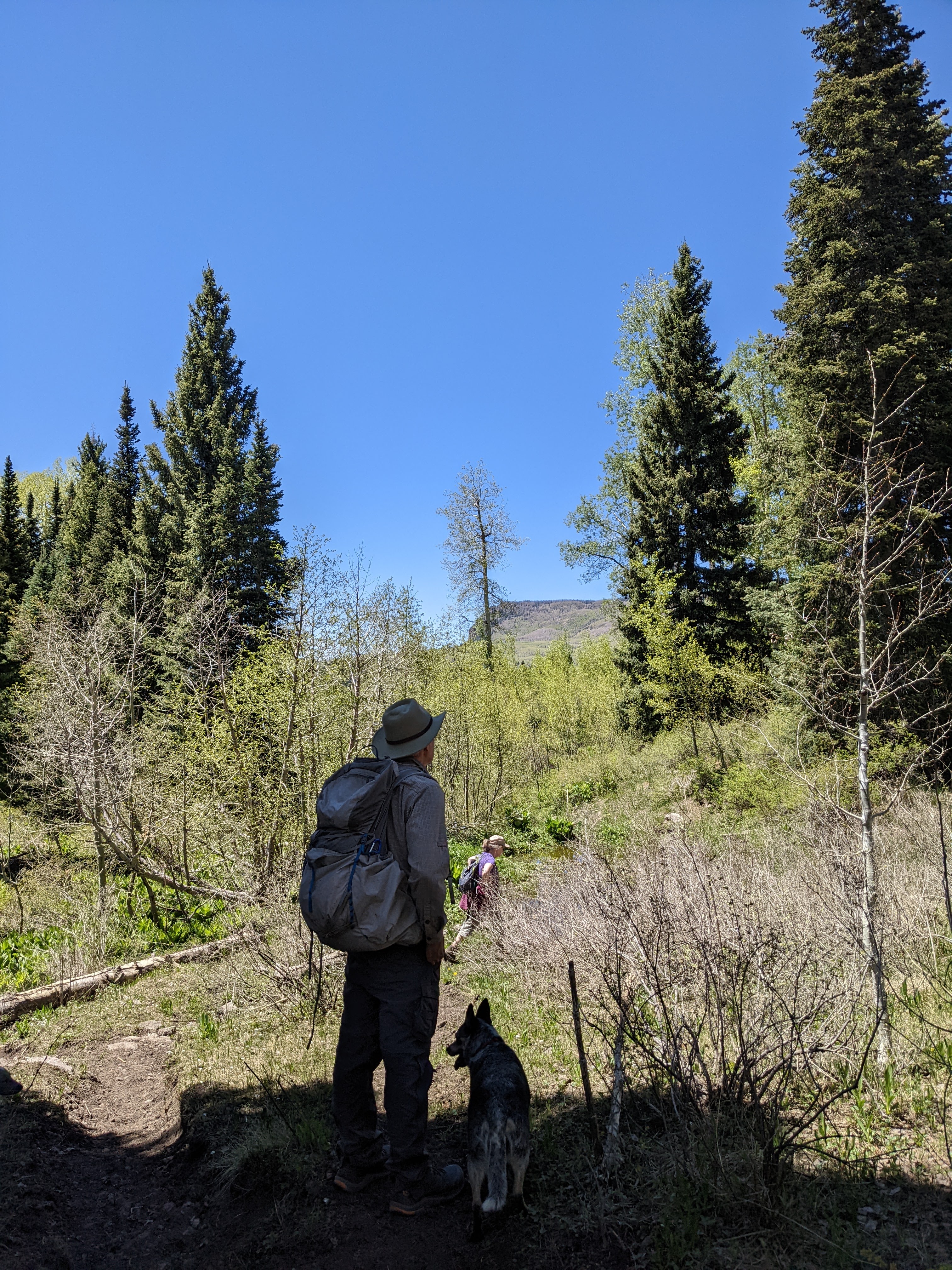 To that end, we went camping up near La Manga pass (Elk Creek). It rained all night! What a joy it was to listen to it on the tent. And it snowed up in the high country above us, prompting the CDTA (Continental Divide Trail Alliance, the group that cares for the trail and the hikers that use it) to urge all hikers out of the South San Juans for a couple days. As a result, our nascent plan to backpack north up the CDT fizzled. We couldn’t go south, as New Mexico has closed the National Forests due to fire danger. So we tried to hike up the Red Lake trail, but it was festooned with blowdown and snow. Then we tried the CDT, but got blown off!