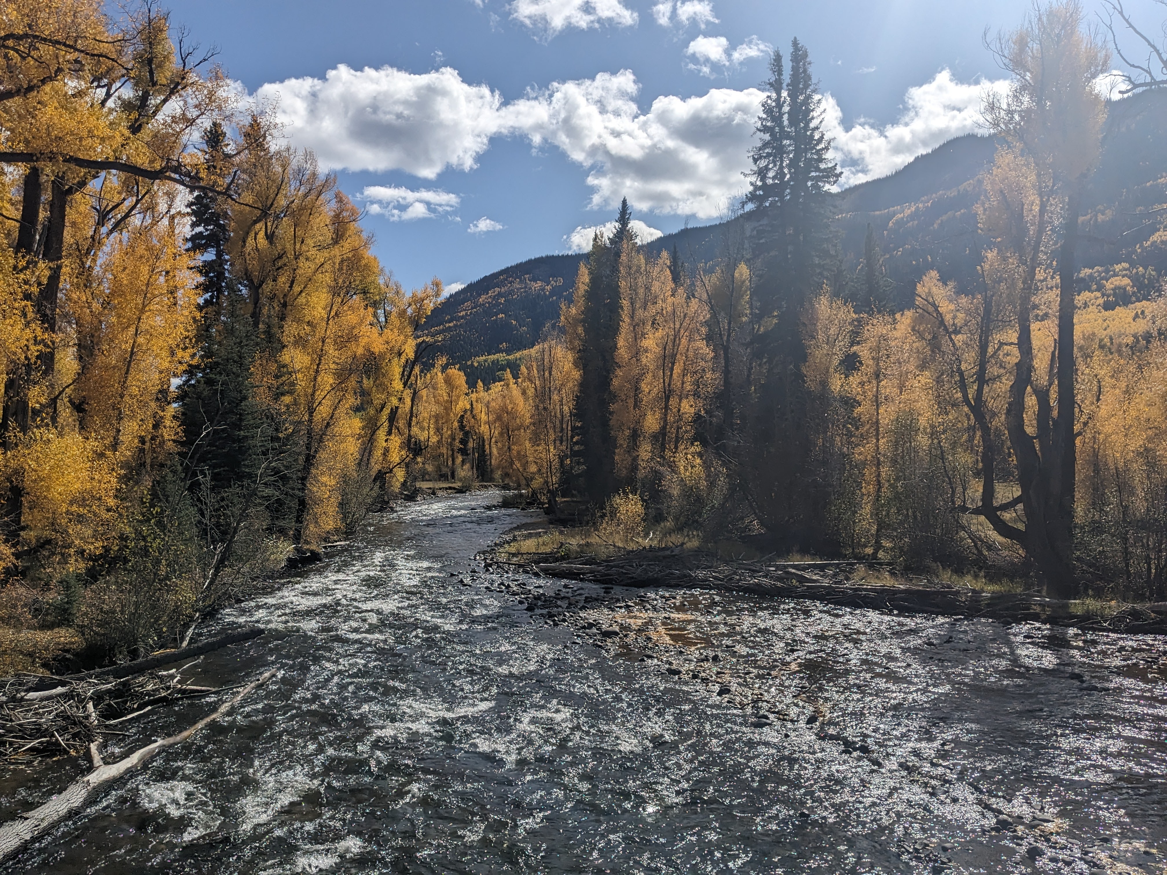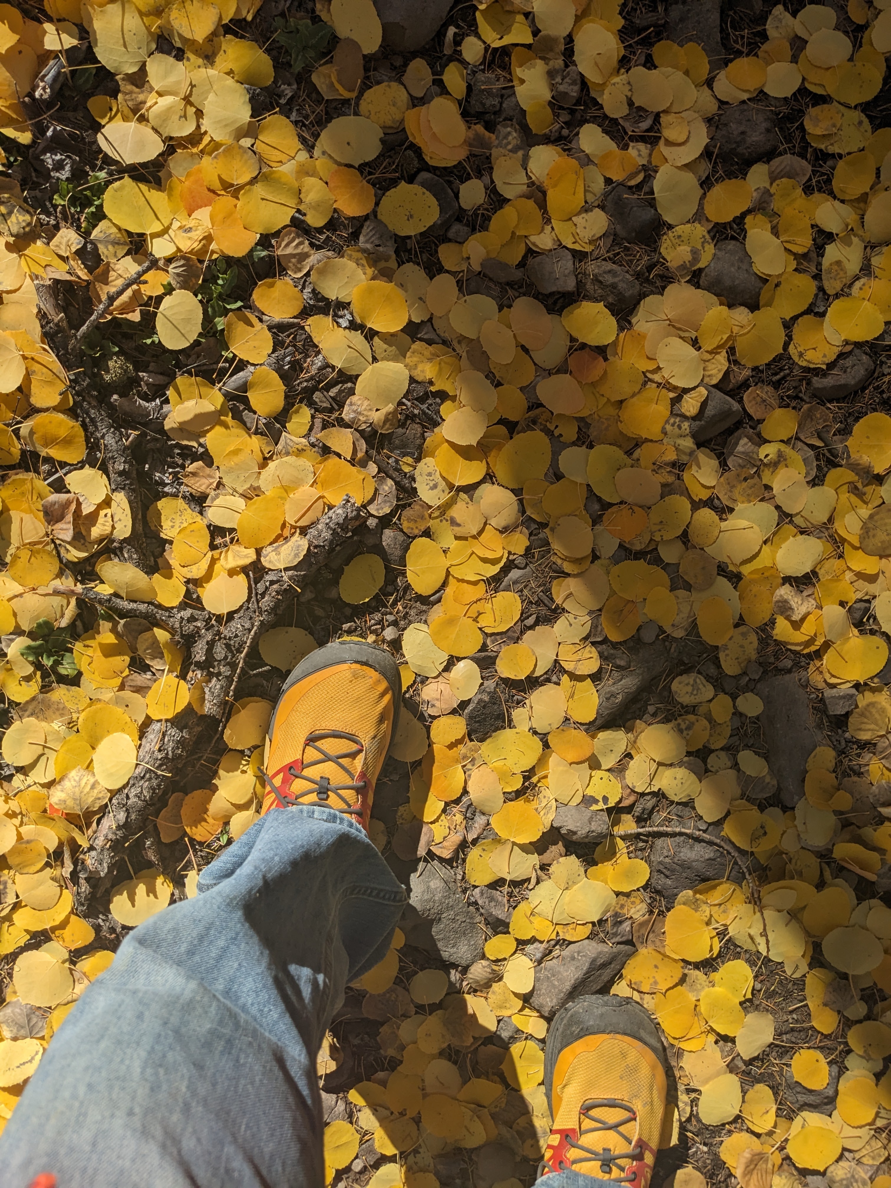 But the one that’s happened most in nature for me has occurred when I am simply walking down a trail. A new trail perhaps, but even one I’ve been on many times. A quiet uncrowded trail, just walking along and around a corner and boom! There’s this astounding vista, and my belly and chest and head are filled with a sense of warmth and wonder and I have a huge, silly grin plastered on my face. It’s physical. Maybe I’ve been in thick trees and make a turn and all of a sudden can see for miles or maybe it’s been in a dark forest of spruce and I traipse across some deadfall thinking of nothing and kazaam! It’s a whole aspen family in full color.