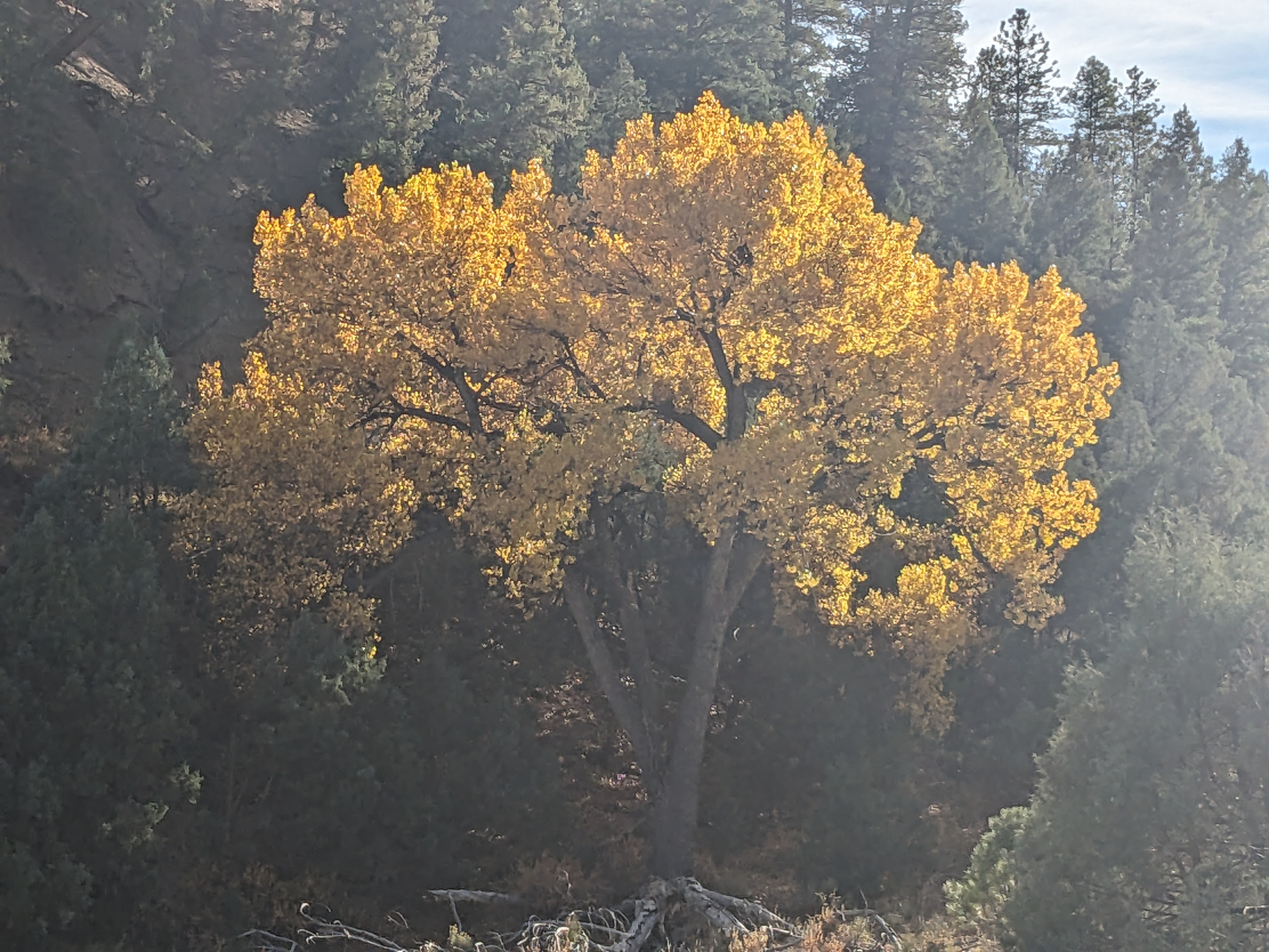 I talk about this capacity for joy now because this is that time of year when much of the country is enjoying the fall colors. Right, this minute. I’m looking at a tree Alan calls Marilyn Monroe. She is a huge cottonwood, tucked back in a corner of our canyon surrounded by junipers and ponderosas. Every year Marilyn turns the most unbelievable, golden color that just shimmers like nothing I’ve ever seen in a cottonwood tree. We have a lot of cottonwoods in the canyon and they’re beautiful and turn golden orange. But this one, because she’s protected, will last for weeks and weeks, just shimmering phosphorescence and brilliance. And every year I see it and I’m shocked, I’m surprised by joy. As I am right now.